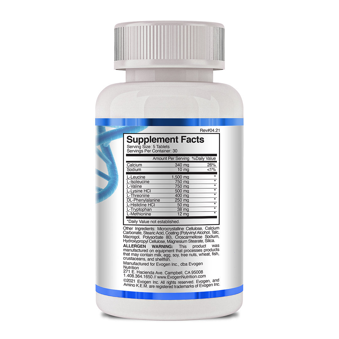 Evogen Nutrition has always set the standard for ultra-clean and pure amino acid sources. Amino K.E.M. tablets are no different and offer a new level convenience compared to the powdered form. This formula is packed with a full spectrum of properly dosed EAA’s and BCAA’s to accelerate recovery & muscle growth anytime of the day or night.†
