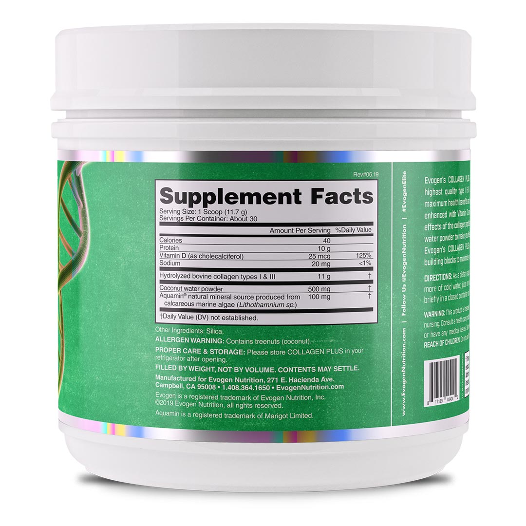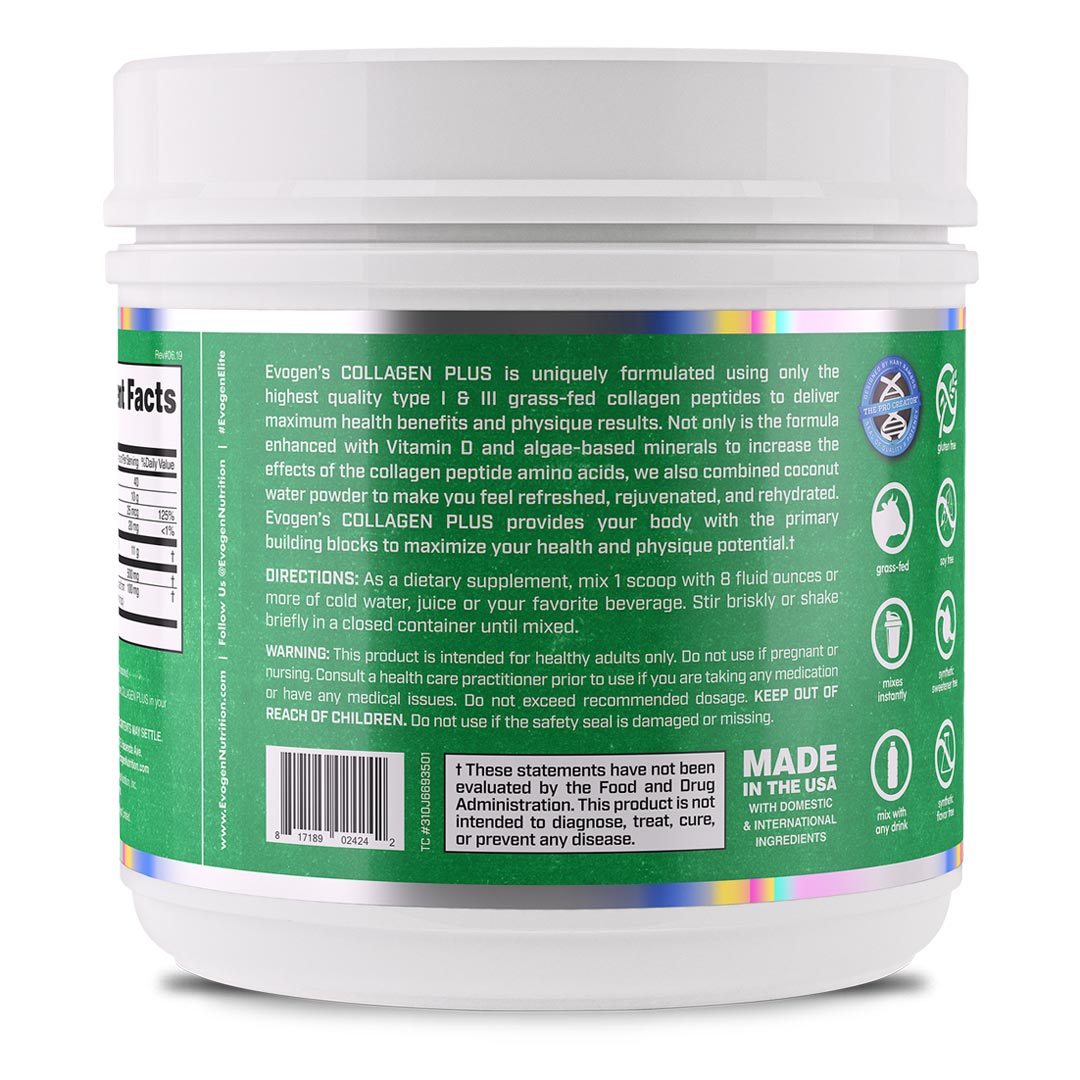 Evogen’s COLLAGEN PLUS HYDRATION is a uniquely formulated product using only the highest quality type I & type III grass-fed collagen peptides to deliver maximum health benefits and physique results. This formula is not only enhanced with Vitamin D and algae-based minerals to increase the effects of the collagen peptide amino acids, but combined with coconut water powder to not only make you feel refreshed and rejuvenated, but rehydrated as well. COLLAGEN PLUS HYDRATION provides your body with the primary building blocks to maximize your health and physique potential.†